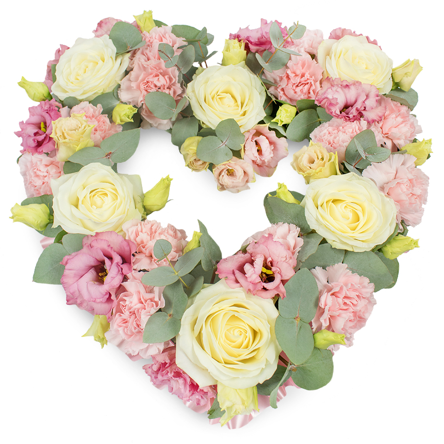 Show your deepest sentiments with our Heartfelt Tribute Flower Arrangement. This exquisite bouquet combines pure white roses, soft pink carnations, elegant pink lisianthus, and refreshing eucalyptus to create a memorable display.